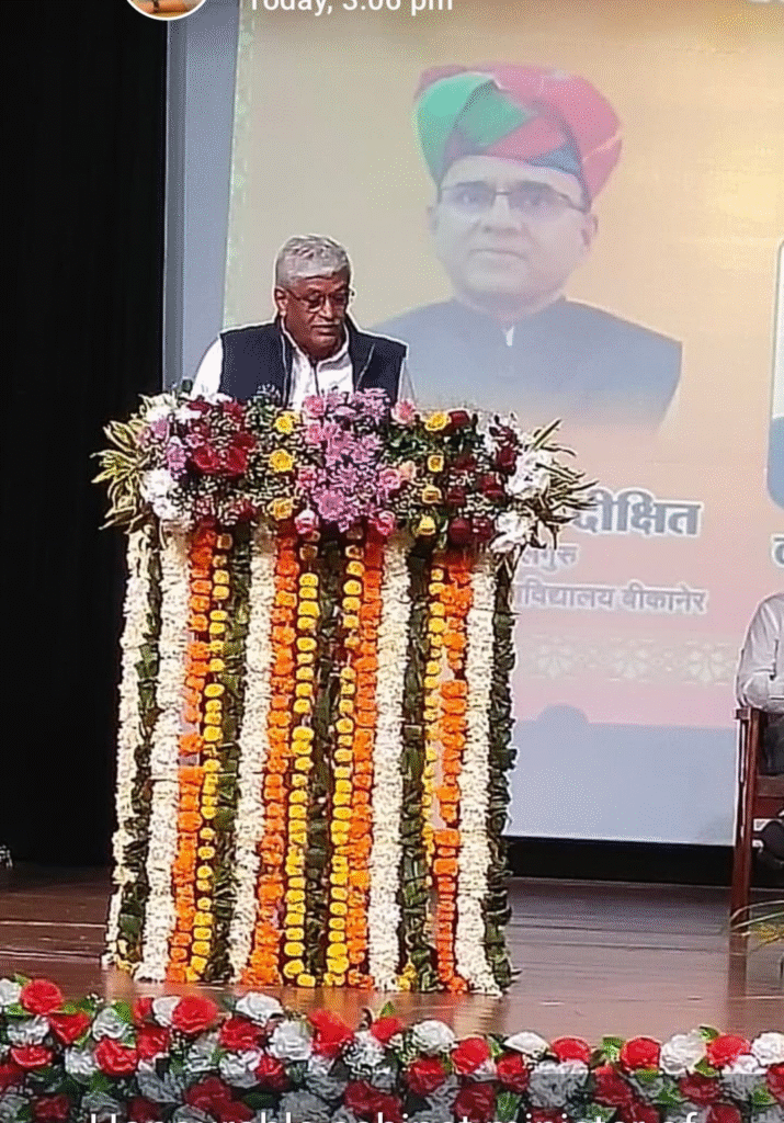 महाराजा गंगासिंह विश्वविद्यालय के कुलगुरु आचार्य मनोज दीक्षित ने स्वागत उद्बोधन दिया। उन्होंने बीकानेर कहा कि बीकानेर अपनी संस्कृति और परंपराओं के लिए विश्व विख्यात है। यहां पर्यटन की दृष्टि से अनेक संभावनाएं हैं। उन्होंने केंद्रीय मंत्री से बीकानेर में इंडियन इंस्टीट्यूट आफ टूरिज्म एंड ट्रैवलिंग मैनेजमेंट की शाखा खोलने का आग्रह किया। साथ ही खाद्य पदार्थों एवं दूध की टेस्टिंग लेब स्थापित करने की आवश्यकता जताई।