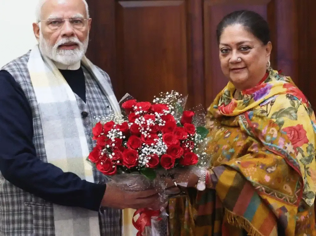 नईदिल्ली28 जुलाई 25 । राजस्थान की पूर्व मुख्यमंत्री वसुंधरा राजे ने आज प्रधानमंत्री नरेंद्र मोदी से मुलाकात की है। इस मुलाकात के बाद राजस्थान की सियासत में हलचल मच गई है। वसुंधरा राजे ने अपने सोशल मीडिया प्लेटफॉर्म पर तस्वीर साझा करते हुए बताया कि उन्होंने प्रधानमंत्री मोदी से शिष्टाचार भेंट की।