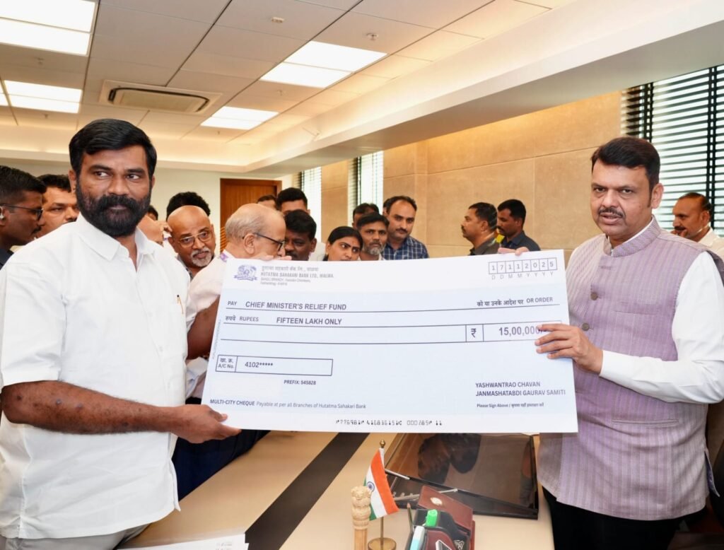 मुंबई, 18 नवंबर । महाराष्ट्र के मुख्यमंत्री देवेंद्र फडणवीस को आज मुंबई में ‘यशवंतराव चव्हाण जयंती गौरव समिति’ के प्रतिनिधि प्रदीप कदम ने भारी बारिश और बाढ़ से प्रभावित पीड़ितों के लिए ‘मुख्यमंत्री राहत कोष’ में 15 लाख रुपये का चेक सौंपा। यह योगदान हाल ही में राज्य में हुई भारी वर्षा से हुए व्यापक नुकसान को देखते हुए एक सराहनीय कदम है, जिसमें हजारों परिवार प्रभावित हुए हैं।